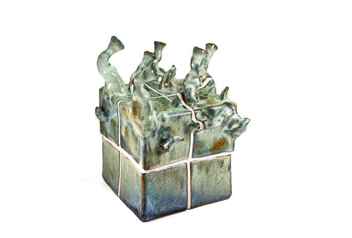 sproutings in a cubic form.made from ceramic tiles. Fired at cone 10, gas kilns reduction atmosphere!All glazes formulated by Fernando Aidar.